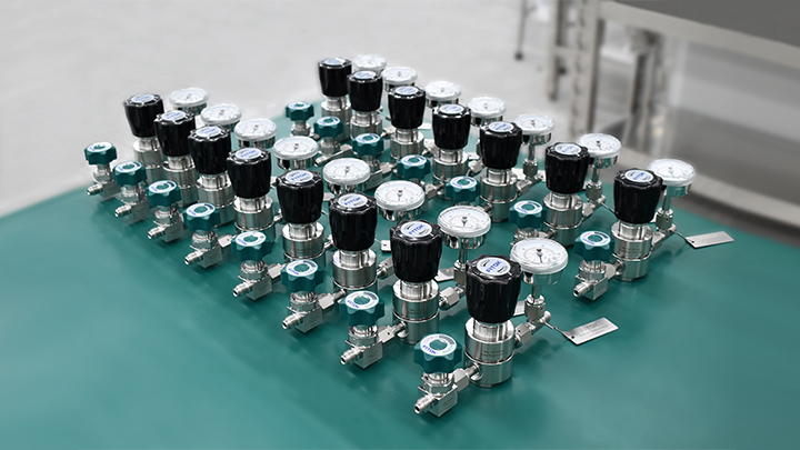 AGH 系列专为高纯气体设计,具有优异的密封性和耐腐蚀性。该系列高纯气体控制组件主要由隔膜阀、减压阀和压力表等配件组成,其主要应用于半导体制造、生物医药和实验室等领域。